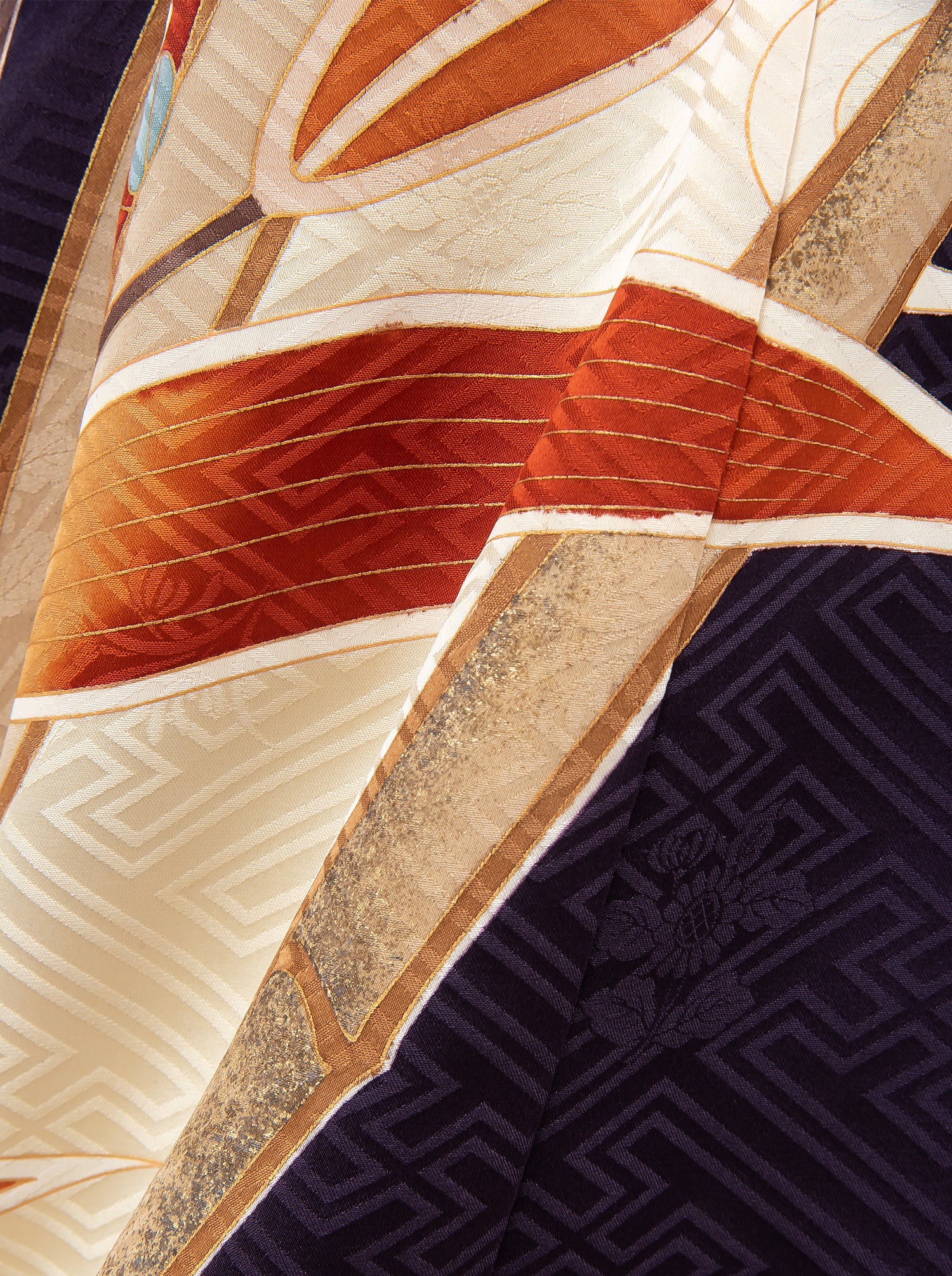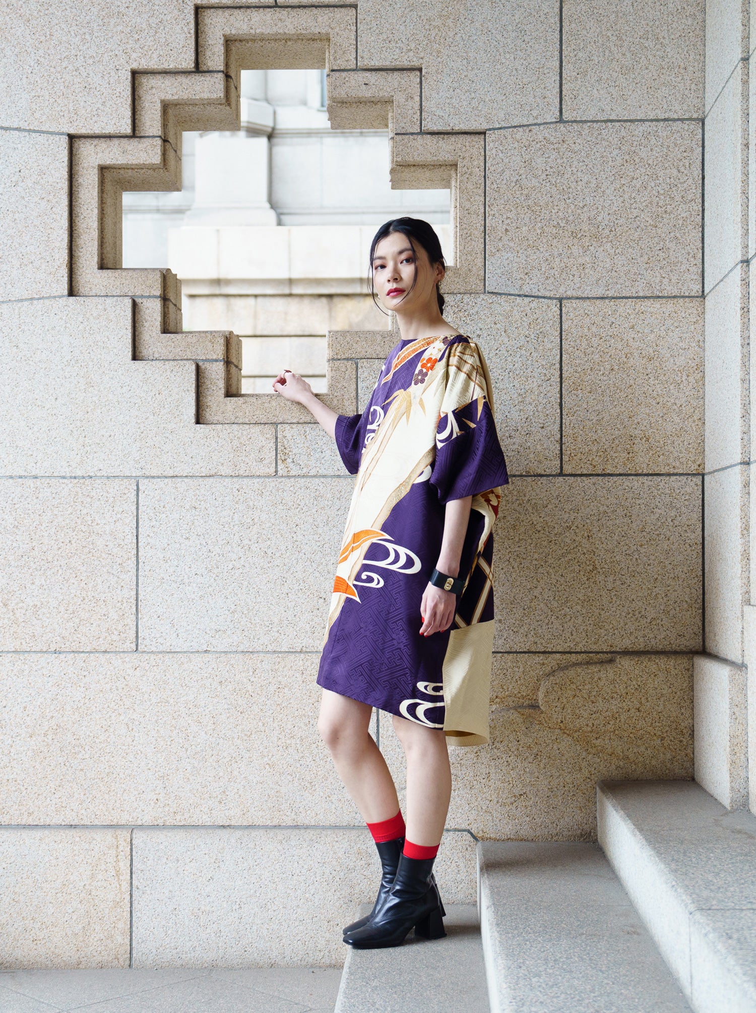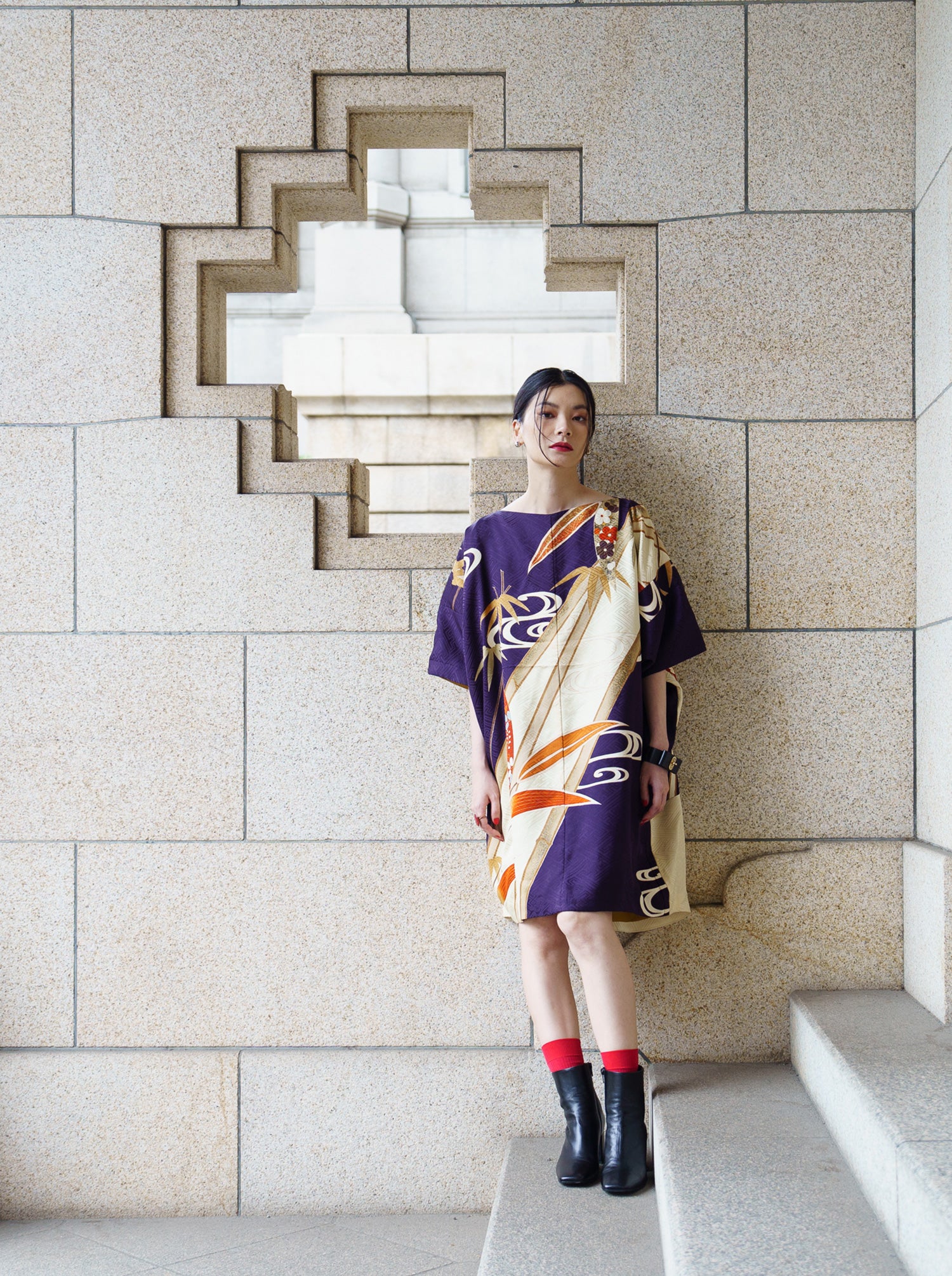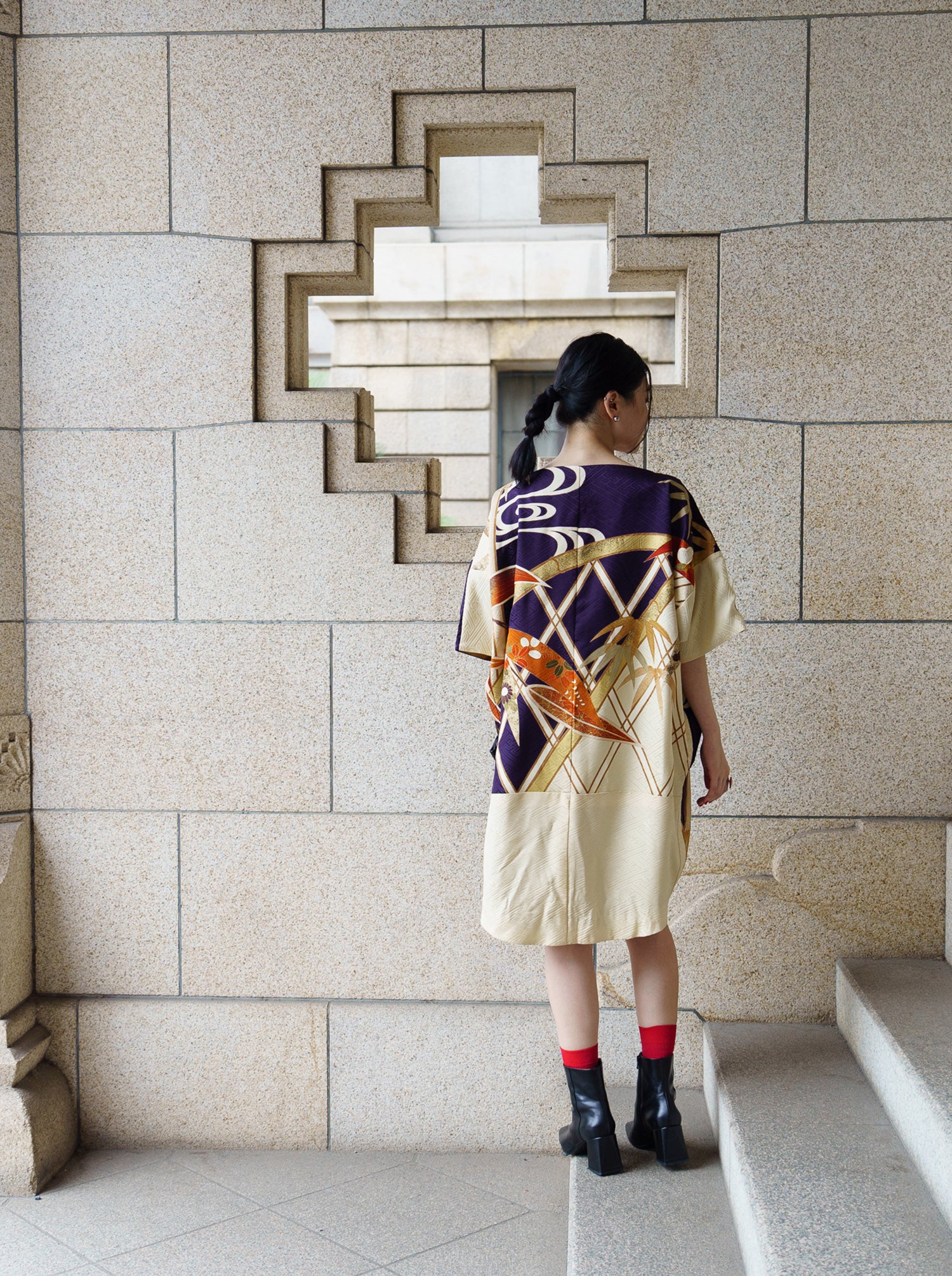 冠婚葬祭の時に第一礼装として着用される「留黒袖」をワンピースドレスにアップサイクルしました。 元来の着物が