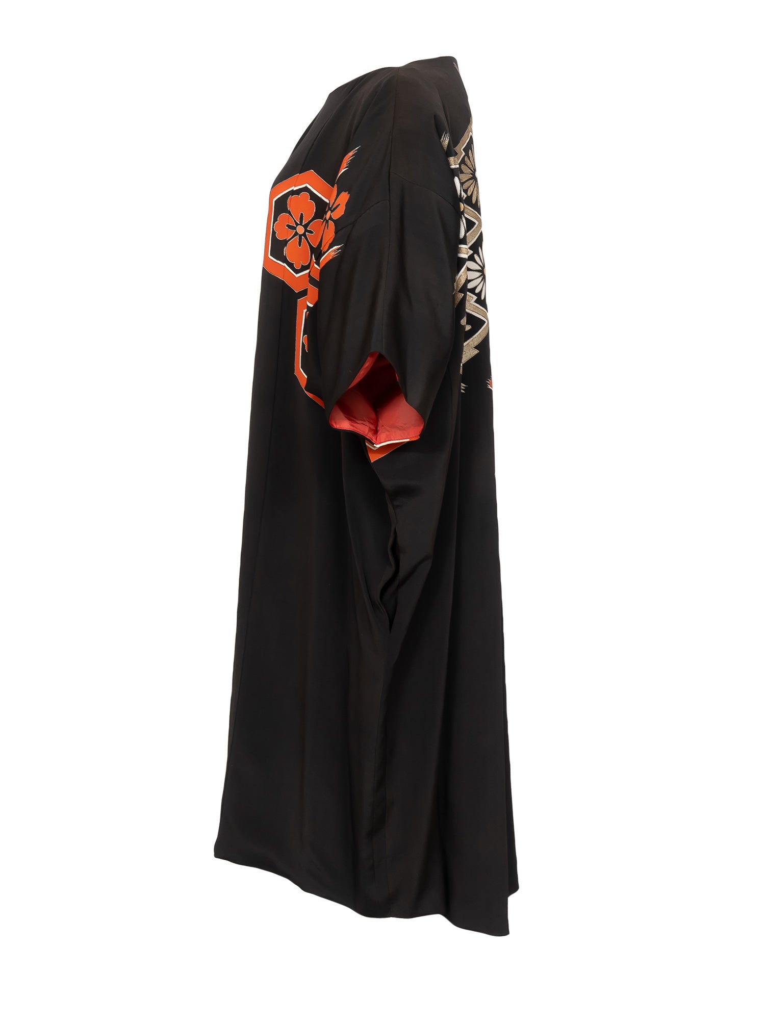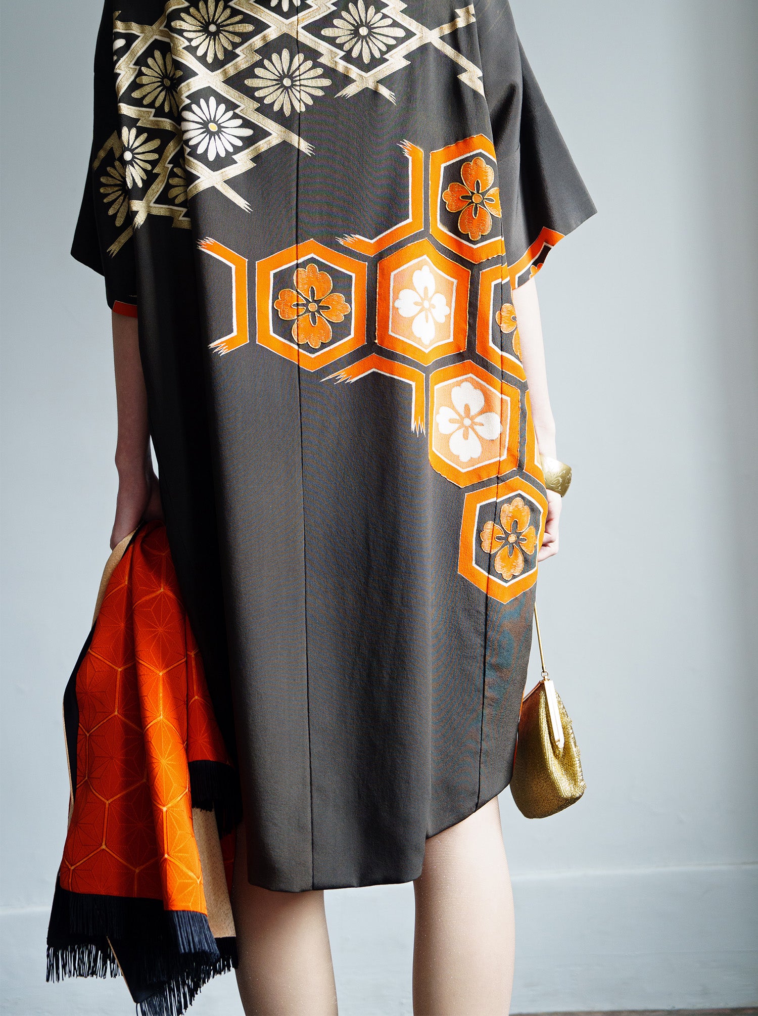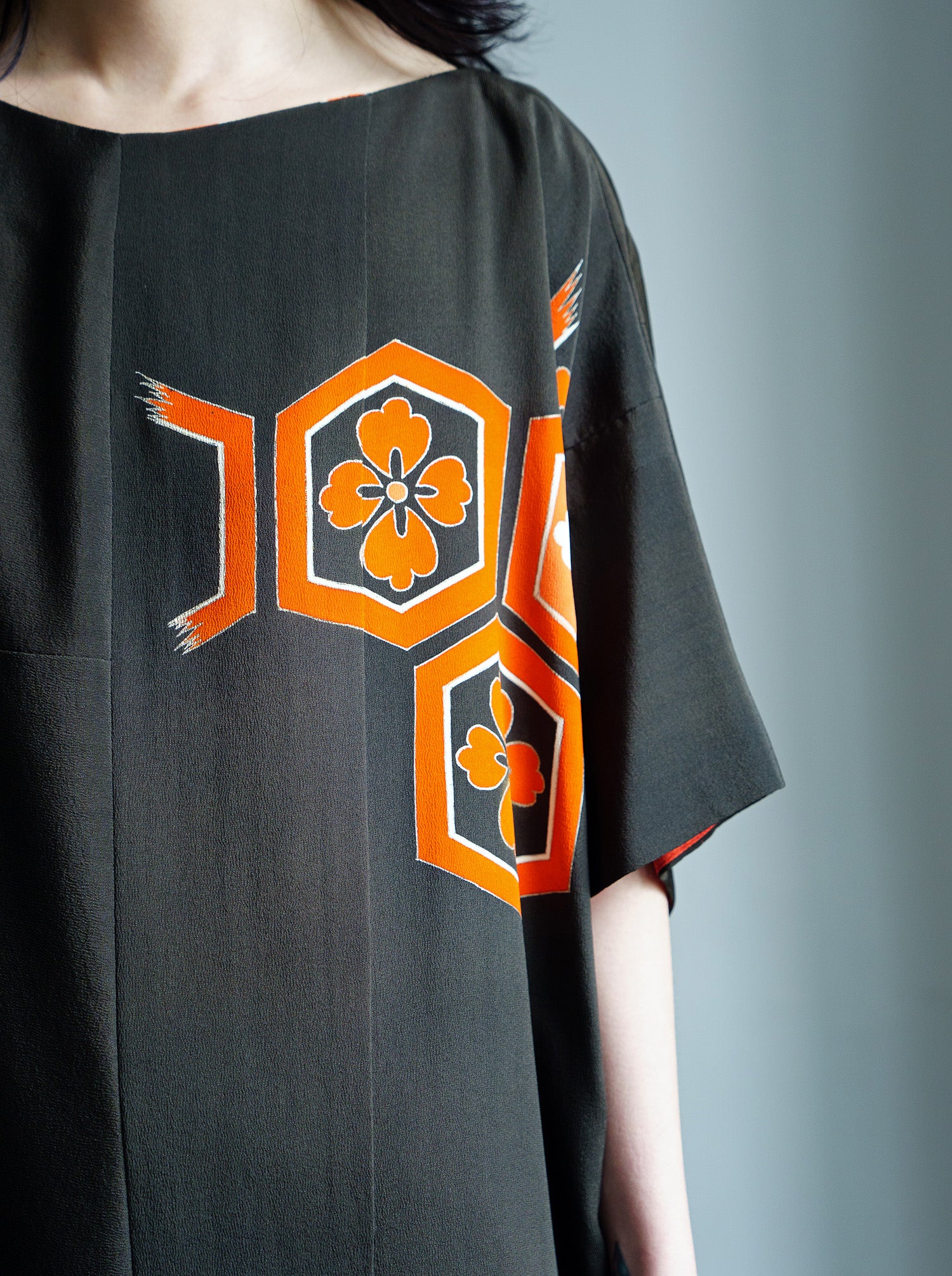 冠婚葬祭の時に第一礼装として着用される「留黒袖」をワンピースドレスにアップサイクルしました。 元来の着物が