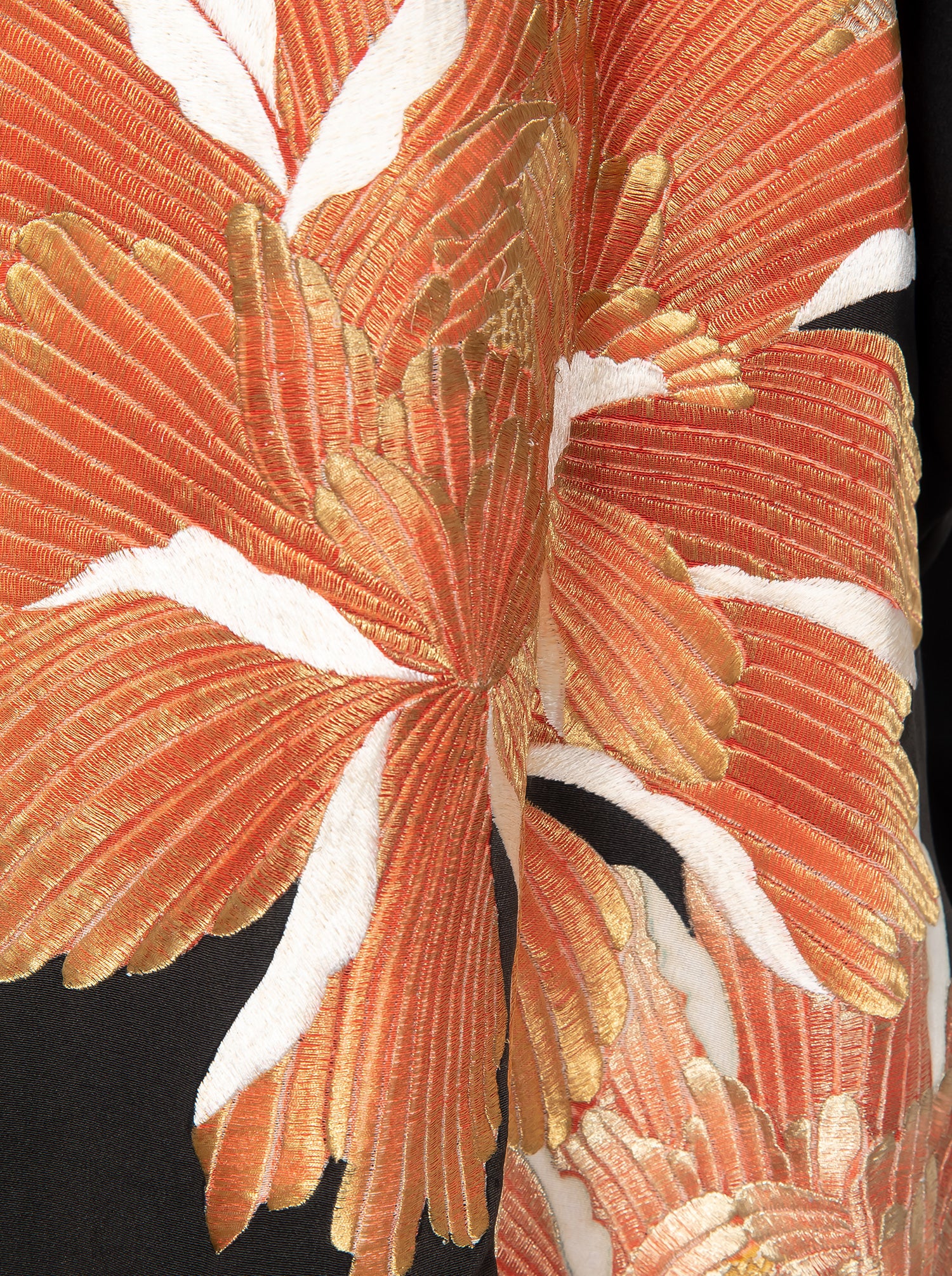 元来の着物が持つ格式の高さはそのままに、大胆なデザイン性と着心地の良さを最大限引き出した贅沢なワンピースドレスです。