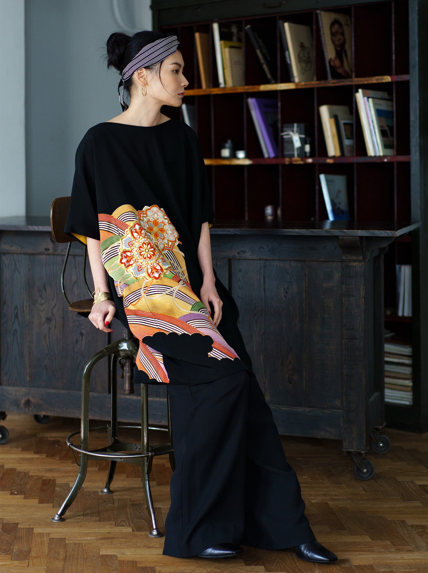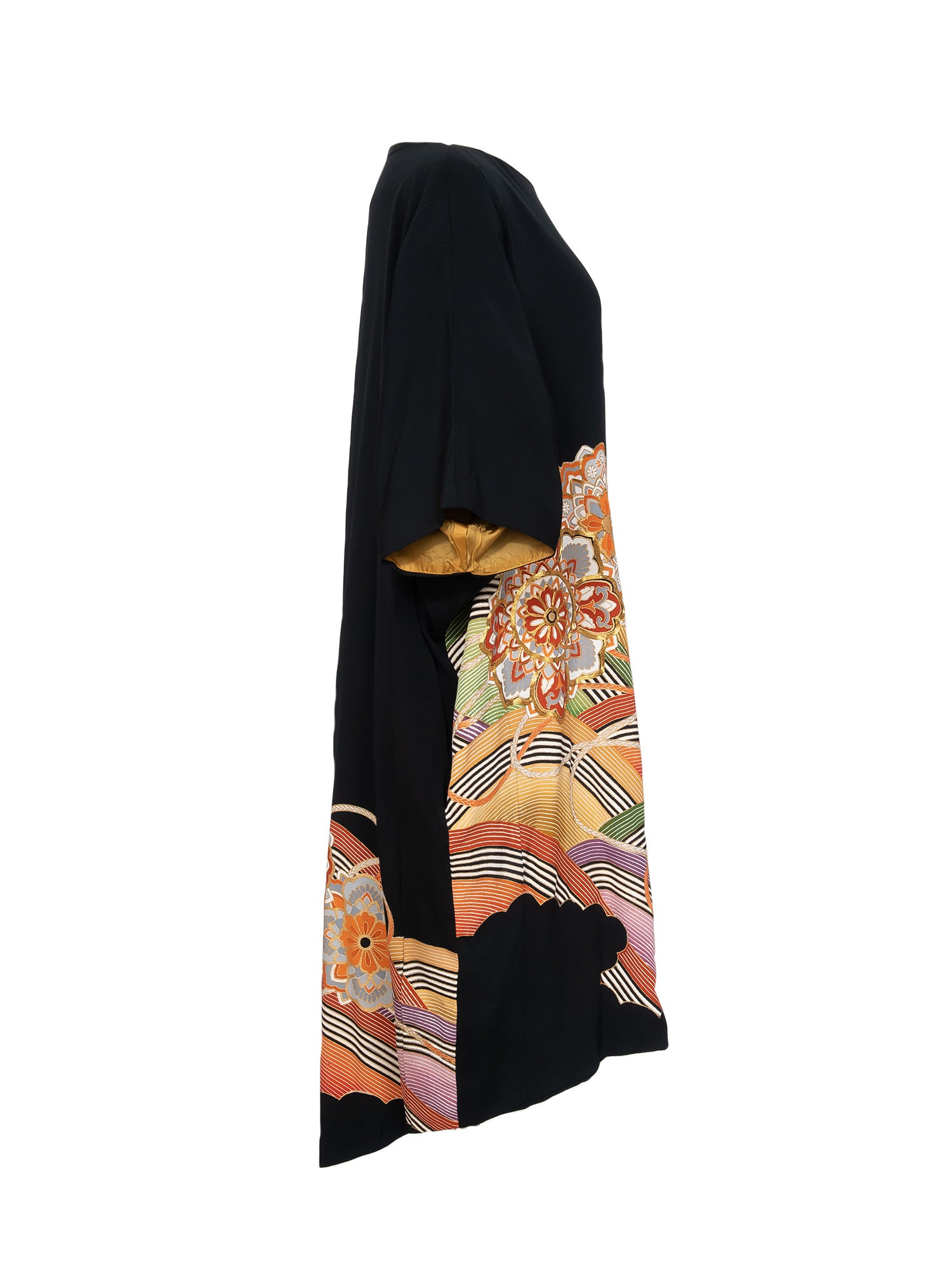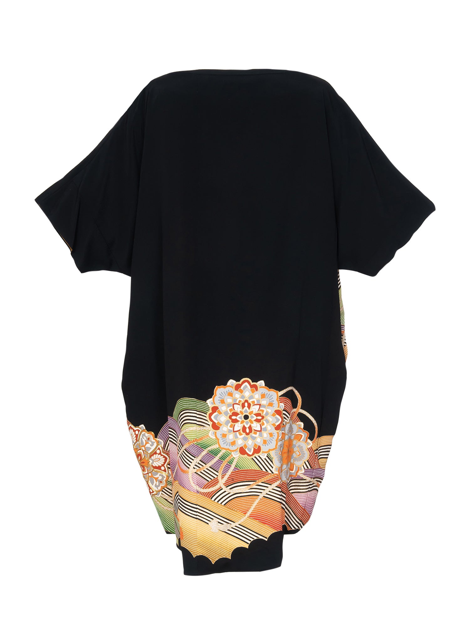 冠婚葬祭の時に第一礼装として着用される「留黒袖」をワンピースドレスにアップサイクルしました。 元来の着物が