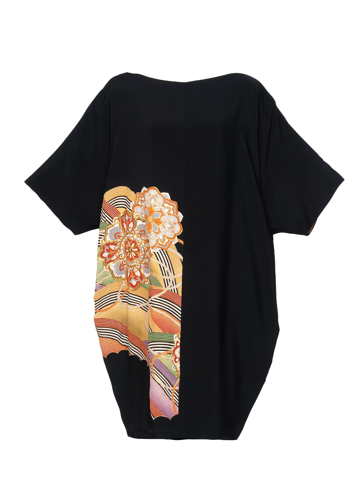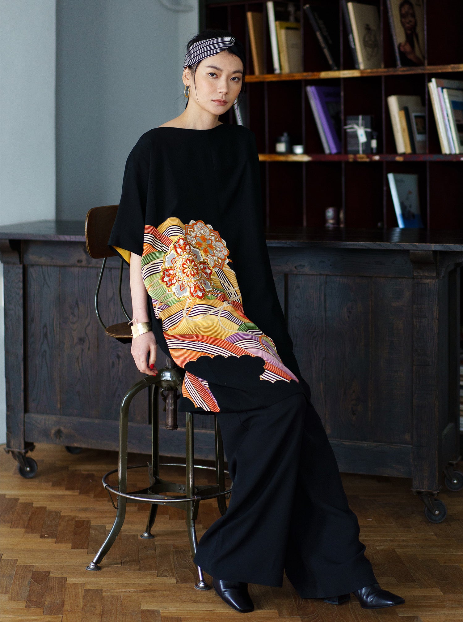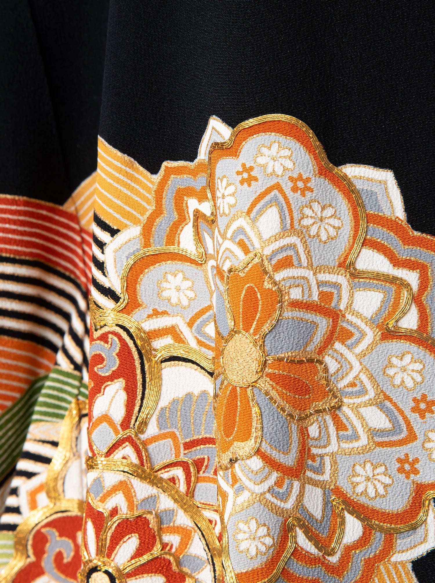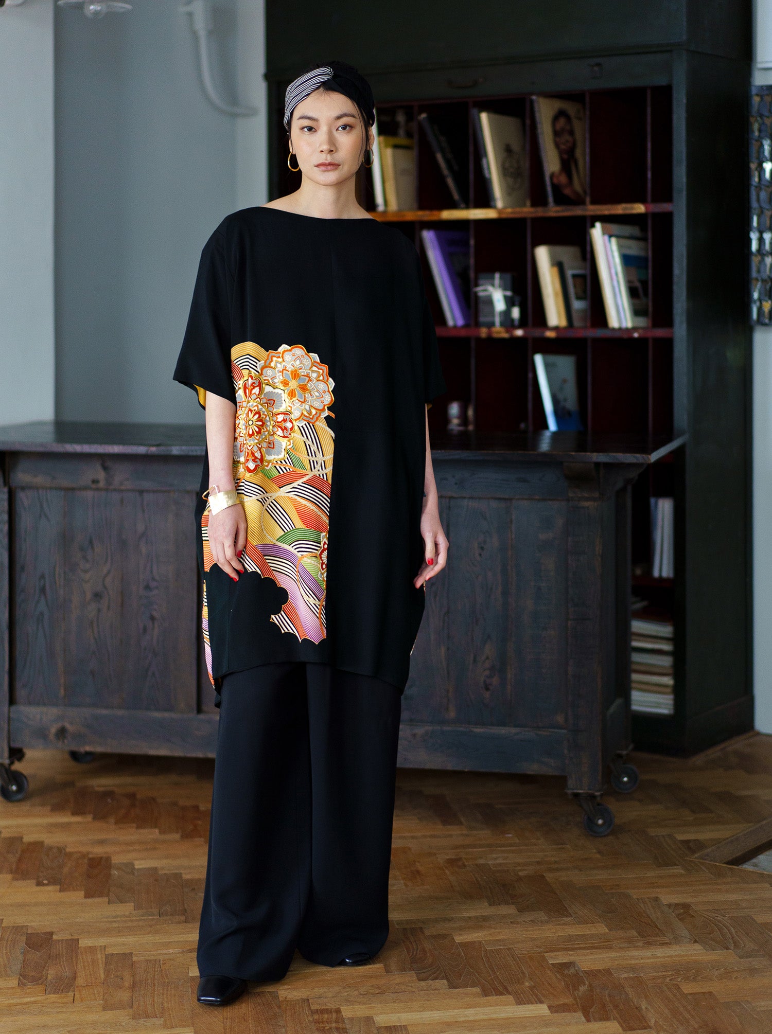 冠婚葬祭の時に第一礼装として着用される「留黒袖」をワンピースドレスにアップサイクルしました。 元来の着物が