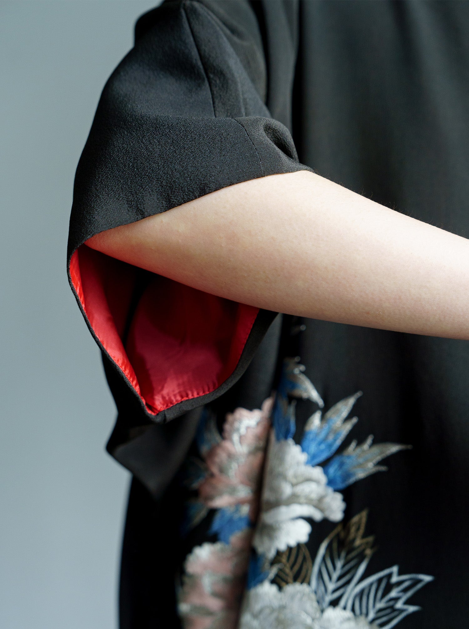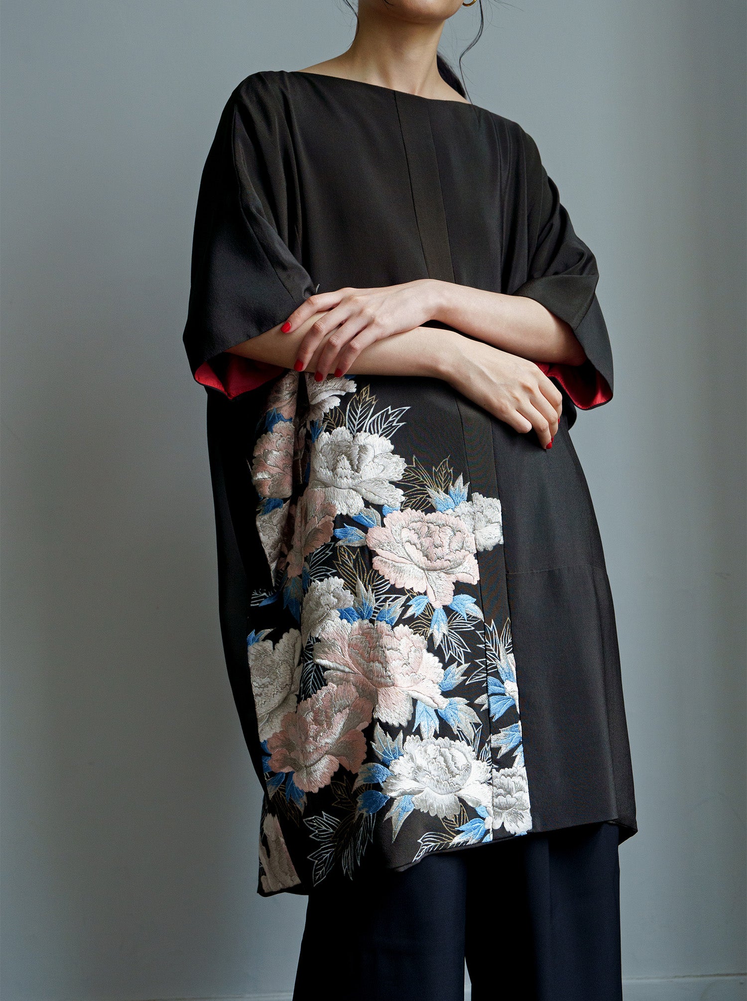 冠婚葬祭の時に第一礼装として着用される「留黒袖」をワンピースドレスにアップサイクルしました。 元来の着物が